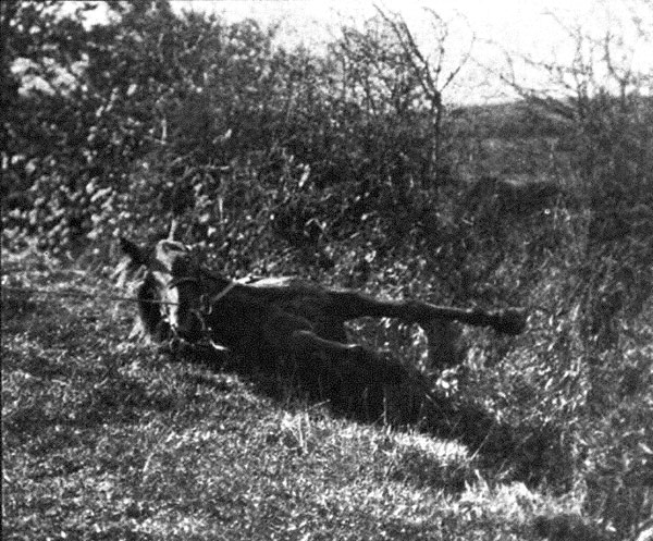 JUMPING OUT OF THE BROOK, THE MARE FELL A MOMENT AFTERWARDS AND ROLLED INTO THE FIELD, HER HIND LEGS HAVING SLIPPED BACK